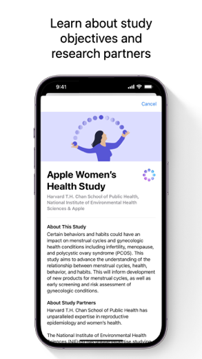 Join the Apple Women’s Health Study, conducted in partnership with the Harvard T.H. Chan School of Public Health and National Institue of Health Sciences to help advance the understanding of menstrual cycles and health conditions such as infertility, osteoporosis, and menopause. Apple Research is a health iPhone app specially designed to be fully-featured fitness app.